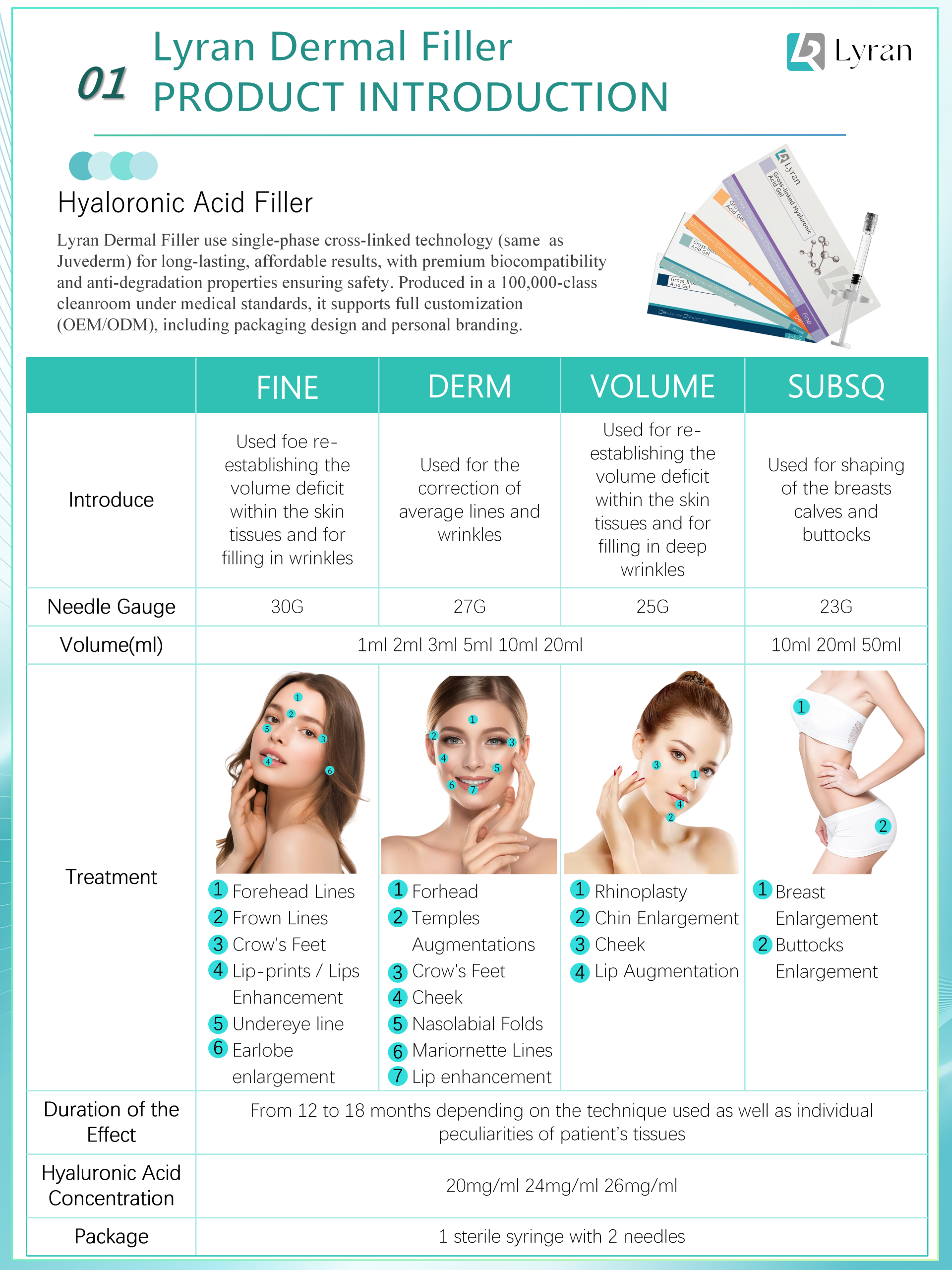 Lyran Dermal Filler is single-phase sodium hyaluronic, it has four series, Fine/Derm/Volume/SubsQ, Choose different series according to different parts of use, including 1ml, 2ml, 3ml, 5ml, 10ml, 20ml, 50ml, 100ml.