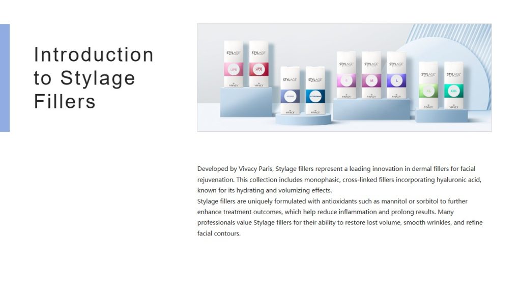 Developed by Vivacy Paris, Stylage fillers represent a leading innovation in dermal fillers for facialrejuvenation. This collection includes monophasic, cross-linked fillers incorporating hyaluronic acid.known for its hydrating and volumizing effects.Stylage fillers are uniquely formulated with antioxidants such as mannitol or sorbitol to furtherenhance treatment outcomes, which help reduce inflammation and prolong results. Many professionals value Stylage fillers for their ability to restore lost volume, smooth wrinkles, and refinefacial contours.