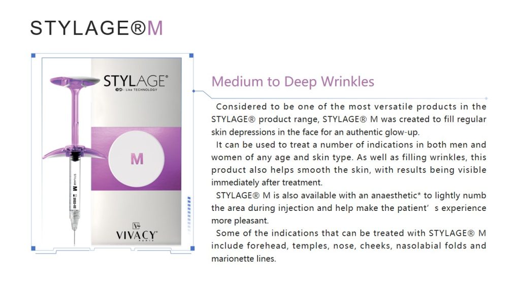 Considered to be one of the most versatile products in the STYLAGE® product range, STYLAGE® M was created to fill regularskin depressions in the face for an authentic glow-up.It can be used to treat a number of indications in both men andwomen of any age and skin type. As well as filling wrinkles, this product also helps smooth the skin, with results being visibleimmediately after treatment.
